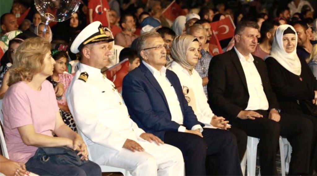 Saygı duruşuyla başlayan program İstiklal Marşı’nın okunmasıyla devam etti. Ardından Mehteran takımı marşlar okudu. Hafız İshak Danış’ın Kuran-ı Kerim tilavetinde bulundu. Sinevizyon gösteriminin yapıldığı programda, Ozan Manas vatandaşlara türkü dinletisi sundu. Vatandaşların yoğun ilgi gösterdiği etkinlikte katılımcıların duygulandığı görüldü. Öte yandan Yazar ve TV sunucusu Bekir Develi, 15 Temmuz’a dair duygu, düşünce ve gözlemlerini aktardı.