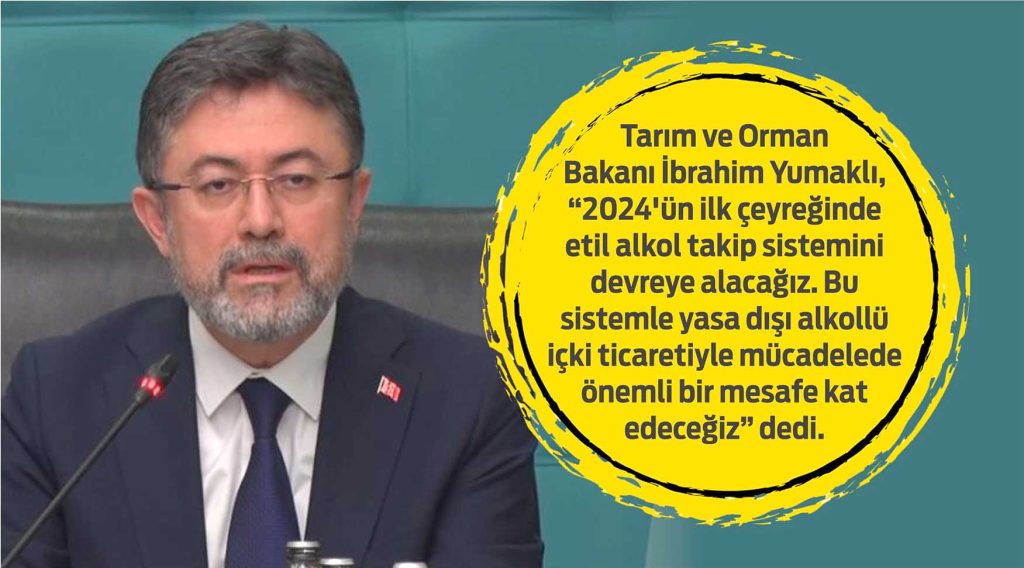 Tarım ve Orman Bakanı İbrahim Yumaklı, “2024’ün ilk çeyreğinde etil alkol takip sistemini devreye alacağız. Bu konu özellikle sahte içki üretiminde can kayıplarına sebep olan, maalesef üzücü sonuçlar doğuran bir husus. Bu sistemle yasa dışı alkollü içki ticaretiyle mücadelede önemli bir mesafe kat edeceğiz” dedi.