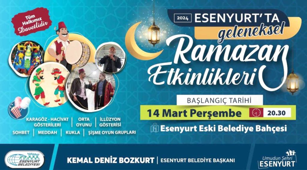 Esenyurt Belediyesi, Ramazan ayı hazırlıklarını tamamladı. Bu yılki etkinlikler, Esenyurt eski belediye bahçesinde yapılacak. 14 Mart Perşembe günü başlayacak olan etkinliklerde Karagöz-Hacivat, orta oyunu, illüzyon, sohbet, meddah ve kukla gibi çeşitli gösteriler Esenyurtlularla buluşacak.